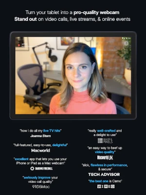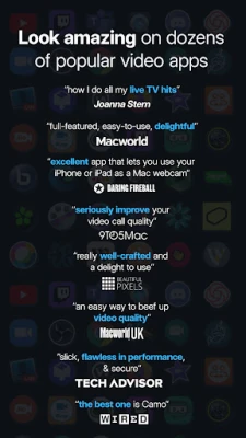 Transformez la caméra de votre téléphone en une webcam professionnelle de haute qualité grâce à Camo. Améliorez instantanément l'image de vos appels vidéo, diffusions en direct et événements en ligne pour vraiment vous démarquer.