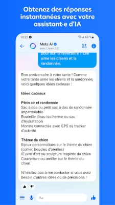 Découvrez une dimension nouvelle avec Meta AI, votre assistant personnel toujours à portée de main. Capable de répondre à vos interrogations les plus diverses, de vous offrir des conseils pertinents pour vos études ou votre quotidien, et même d'être votre partenaire créatif pour générer ou modifier des images, Meta AI enrichit vos discussions. Au-delà de l'IA, Messenger vous offre une maîtrise totale de vos échanges : modifiez un message jusqu'à 15 minutes après l'envoi, partagez des fichiers volumineux allant jusqu'à 100 Mo dans des formats variés (Word, PDF, Excel), ou optez pour des messages éphémères dont vous déterminez la durée de vie pour une confidentialité optimale. *Veuillez noter que Meta AI est disponible dans certaines régions et langues, avec une extension à venir.*