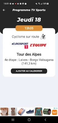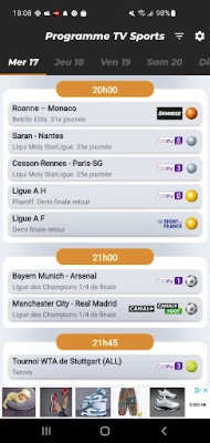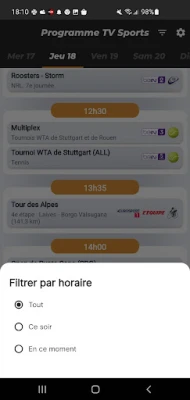 Explorez l'action en cours avec notre onglet dynamique "En ce moment", votre boussole en temps réel pour ne rien rater des confrontations qui se déroulent sous vos yeux. Organisez votre planning sportif avec une aisance déconcertante grâce à notre programme TV détaillé, s'étendant sur plusieurs jours à l'avance. Mieux encore, personnalisez votre expérience en configurant des alertes calendrier, vous assurant d'être averti juste avant le coup d'envoi de vos rencontres préférées. C'est l'outil parfait pour anticiper et synchroniser votre agenda avec le rythme effréné du sport.