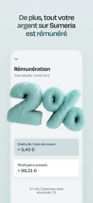 Allez au-delà de la simple consultation grâce aux fonctionnalités de budget intégrées de Sumeria. Validez chaque transaction pour confirmer sa vérification, créez des catégories et sous-catégories personnalisées pour une analyse précise de vos dépenses, et suivez l'évolution de vos comptes via des graphiques mensuels clairs. Avec Sumeria, vous prenez le contrôle total de votre situation financière. Cerise sur le gâteau : votre argent travaille pour vous. Profitez d'une rémunération attrayante de 4% sur l'intégralité de vos fonds, même ceux de votre compte courant. Ces intérêts sont versés mensuellement, nets d'impôts, augmentant passivement la valeur de votre capital.