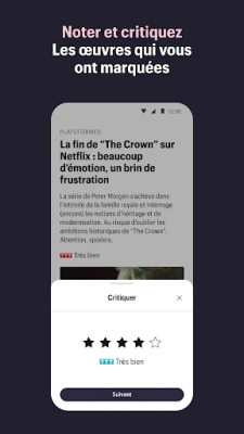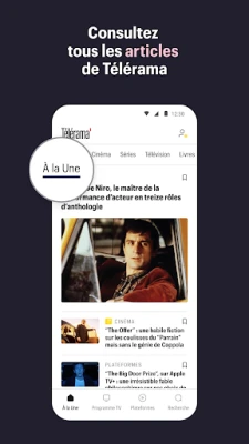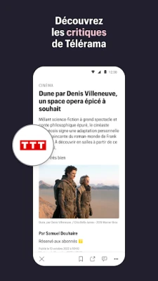 À la recherche d'une critique spécifique ou de la note Télérama pour le dernier film de votre réalisateur préféré ? Notre fonction de recherche intuitive vous offre un accès instantané à l'intégralité des avis de nos experts. Et pour une immersion totale, votre espace personnel vous réserve chaque semaine l'édition numérique du magazine Télérama et son supplément "Sortir", optimisés pour une lecture confortable sur smartphone ou tablette. Pour enrichir davantage votre expérience, la Formule Numérique, accessible directement depuis l'application, vous ouvre les portes d'un monde de contenus exclusifs : toutes les notes, critiques et articles réservés aux abonnés, ainsi que l'accès hebdomadaire au magazine et son supplément, le tout via un abonnement mensuel sans engagement.
