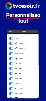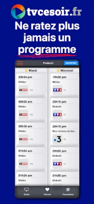 La personnalisation est au cœur de l'expérience **TVCeSoir**. Masquez les chaînes que vous ne recevez pas et organisez vos préférées en tête de liste pour un accès rapide et direct. Pour ne jamais manquer un instant de vos programmes les plus attendus, activez les alertes optionnelles qui vous enverront une notification juste avant le début. Cette application, issue de la plateforme reconnue tvcesoir.fr, est proposée gratuitement, son fonctionnement étant financé par la publicité, vous garantissant ainsi un accès illimité à une information programme complète et à jour.
